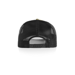 Fabric: Mid weight, 100% cotton front and peak, 100% polyester mesh back Construction: High profile - snapback cap, flat peak Contrast mesh back, plastic snapback, tonal under-peak lining One size fits all Tear-out AS Colour label